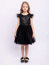 Платье для девочек. Новинка. Платье из трикотажа А-образного силуэта с открытыми плечами и рукавами воланами. По всей линии груди проходит декоративная трикотажная лента, которая спереди формирует угол. Принт в виде птички колибри и надписи с разноцветным глиттером, перевод Новая атмосфера . Платье имитирует многослойность полосатый топ и сарафан.