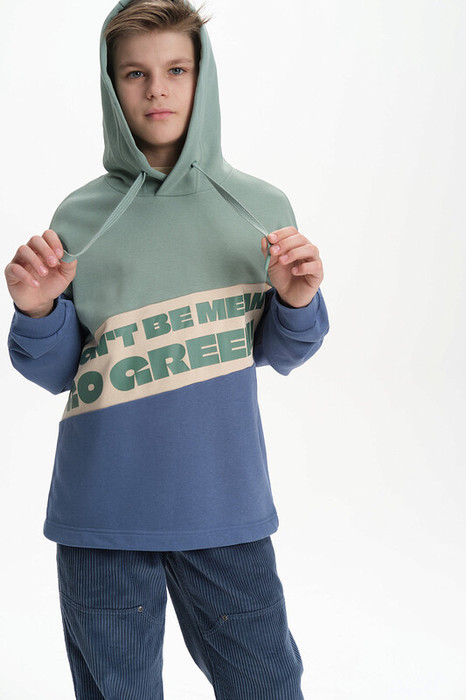 Худи для мальчика без начеса – актуальная вещь в любом сезоне, будь то весна, лето или осень. Кофта спортивная для мальчика выполнена из плотного футера-петля, который отлично согревает в прохладную погоду и при этом хорошо пропускает воздух – ребенок активно двигается, играет, не потеет. Толстовка свободного покроя оверсайз со спущенным плечом, углубленной проймой. Рукава а также низ изделия на манжете из рибаны. Кофта без карманов. Капюшон на запахе со шнурками для регулировки. Пайта для мальчика выполнена в трех цветах. По переду текстовый принт. Перевод принта "color the world in green" - раскрась мир в зеленый цвет. Размерный ряд подходит как для малышей так и для подростков.