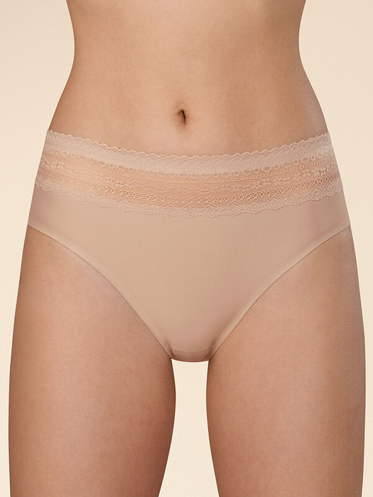 Женские трусы-слипы с высокой посадкой. Изготовлены по бесшовной технологии с минимум швов. Кромки по ноге и по талии подогнуты и приклеены, хлопковая приклеенная ластовица. Нежное геометричное кружево по линии талии высотой 5 см – не передавливает тело и не натирает кожу. Модель оценят те, кто ищет незаметное и невесомое белье на каждый день или особого случая.