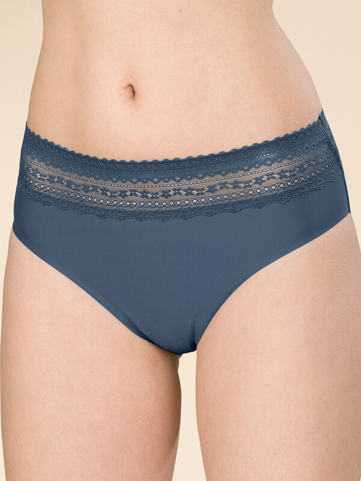 Женские трусы-слипы с высокой посадкой. Изготовлены по бесшовной технологии с минимум швов. Кромки по ноге и по талии подогнуты и приклеены, хлопковая приклеенная ластовица.  Нежное геометричное кружево по линии талии высотой 5 см – не передавливает тело и не натирает кожу.  Модель оценят те, кто ищет незаметное и невесомое белье на каждый день или особого случая.