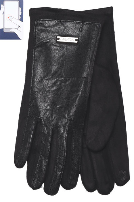 Подклад: Велюр Тип изделия: Перчатки Состав: Иск. замша Место: П2-3-К3Перчатки женские сенсорные (нашивка на кончике указательного пальца), выполнены из иск.замши на велюровой основе сверху вставка из иск.кожи.