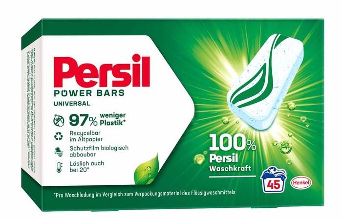 Persil Power Bars Universal — это мощные предварительно дозированные универсальные моющие средства для белого белья. Благодаря 100% моющей способности они удаляют даже самые стойкие пятна уже при 20°C и обеспечивают сияющую чистоту одежды. Упаковка содержит 45 брусков стирального порошка, защищенных водорастворимой и биоразлагаемой защитной пленкой. Защитную пленку не нужно снимать перед использованием.