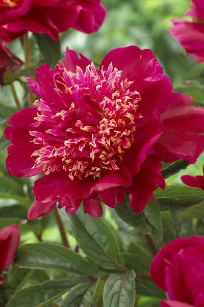 ПОЛУМАХРОВЫЙ, японская форма цветка, яркий, малиново-рубиновый, стаминодии с кремовыми кончиками, Н-70см, цветок 16см