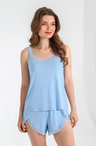 Пижама молодежная состоит из футболки и бриджей. Футболка асимметричного кроя с принтом, одним боковым карманом, рукав втачной, обработан планкой. Бриджи прилегающие с карманами, пояс на резинке.