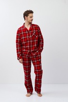Мужская пижама на пуговицах состоит из рубашки с английским воротником и прямых брюк на мягкой и комфортной резинке в поясе. Рубашка декорирована контрастным кантом, накладным карманом на груди. Брюки прямые, свободного прилегания.
