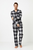 Пижама мужская со штанами CALEB для вашего ночного комфорта. Пижама выполнена из хлопковой фланели. Рубашка на пуговицах, с длинными рукавами, отложным воротником. Штаны длинные, свободной формы, с эластичным поясом с завязкой и боковыми карманами. Расслабьтесь с максимальным комфортом и стилем в пижаме CALEB.