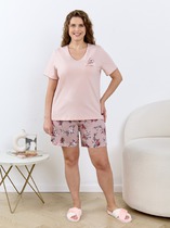 Пижама женская из трикотажного полотна «кулирка» в комбинации двух видов: гладкокрашеного и с набивным рисунком, состоящая из футболки и шорт. Футболка – из гладкокрашеного полотна, с короткими цельнокроеными рукавами, горловиной V-образной формы. Низ рукавов и горловина обработаны декоративной строчкой «кроше», на полочке печать, выполненная в технике «шелкографии».Шорты – из полотна с набивным рисунком, удлиненные, свободного покроя, с эластичной тесьмой по талии.