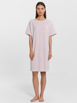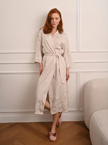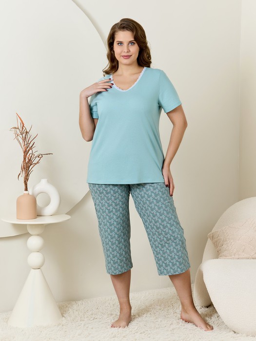 Пижама женская из трикотажного полотна «кулирка» в комбинации двух видов: гладкокрашеного и с набивным рисунком, состоящая из футболки и бридж. Футболка – из гладкокрашеного полотна, с короткими втачными рукавами и горловиной V-образной формы. Срезы горловины обработаны узким кружевом.Бриджи – из полотна с набивным рисунком, свободные классического покроя, с эластичной тесьмой по талии.