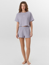Пижама молодежная из гладкокрашеного трикотажного вискозного полотна, состоящая из топа и шорт. Топ - на узких бретелях, полочка – с лифом «бюстье», отделанным кружевом, в центре лифа – разрез, окантованный основным материалом. Основная деталь переда присборена по шву соединения с лифом. Верхний срез спинки и проймы окантованы основным материалом, бретели вытачаны из окантовки.Шорты – средней длины, с эластичной тесьмой по талии.