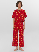Пижама женская из трикотажного вискозного полотна с набивным рисунком, с отделкой кружевом, состоящая из майки и шорт. Майка - слегка расширенная книзу, с кружевной вставкой-кокеткой V-образной формы и небольшой драпировкой в центре груди.Шорты – удлиненные, с эластичной тесьмой по талии.