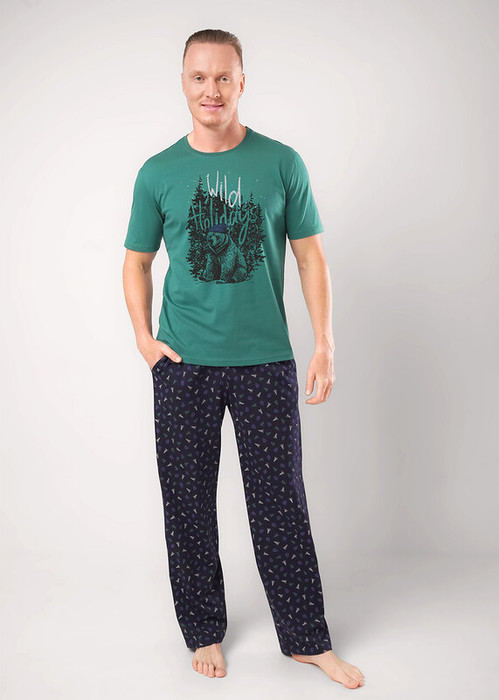 Набор мужской состоящий из футболки и брюк. Футболка из хлопковой кулирной глади с коротким рукавом спереди авторский принт. Брюки прямые из набивной кулирной глади на широком поясе с резинкой и шнуром, по бокам удобные карманы.