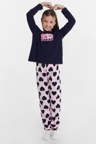 Пижама детская из мягкого и теплого трикотажа — футера с начесом. Подходит для сна и просто для отдыха дома. Кофточка с длинным рукавом имеет круглый вырез, горловина обработана эластичной тесьмой из рибаны. Вшитая планка украшена цветными кнопками. Низ рукава и низ брюк имеет манжет, созданный из основного полотна. В этой пижаме комфортно и уютно