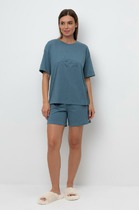 Пижама женская, состотящая из блузы и шорт. Блуза пижамная - из полотна "кулирка" в клетку, свободжного покроя, с короткими цельнокроеными рукавами, V-образной горловиной и центральной бортовой застежкой на обметанные петли и пуговицы. Борта и горловина окантованы основным материалом. Шорты - из полотна "кулирка" в клетку, расклешеные, короткие, с эластичной тесьмой по талии.