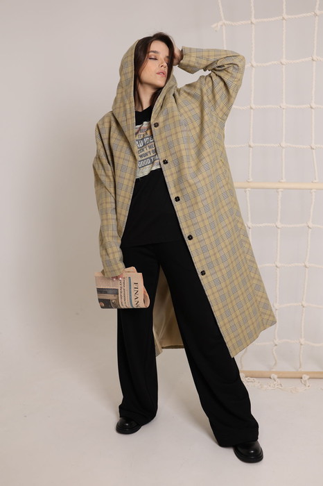 Неверояно стильный кардиган из натуральной ткани  в клетку. Капюшон,карманы,  застежка на пуговицы, сьемный пояс и….. Шарм..