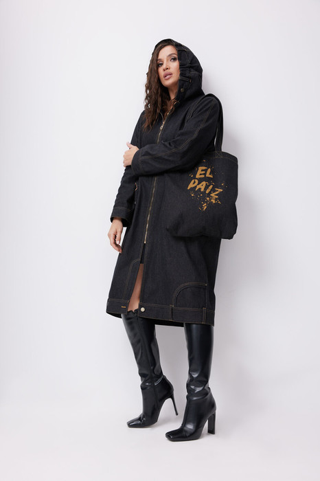 Комплект женский, состоящий из плаща и сумки-шоппера. Плащ прямого силуэта. Рукав втачной, двушовный, полной длинны, с притачной манжетой по низу. Спинка со средним швом, заканчивающимся шлицей, в виде имитации гульфика. Перед с фигурными накладными карманами и застёжкой - молнией, по центру. Низ переда и спинки с отделочными элементами, имитирующими пояс джинс. Плащ с капюшоном, декорирован элементами, имитирующими пояс джинс. Боковые участки капюшона с резинкой. Передняя часть капюшона с декоративной патой, застёгивающейся на петлю и пуговицу-болт. Плащ декорирован двойными отделочными строчками с нитками контрастного цвета, хольнитенами, нашивкой. В комплекте сумка - шоппер из основной ткани, на подкладке, с фирменной печатью.