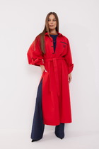 Плащ женский, свободного силуэта без подкладки. Воротник отложного типа. Рукав широкий спущенный с патой. В боковых швах карманы и высокие разрезы. Застежка на кнопки. По левой части переда накладной карман с вышивкой.