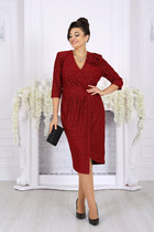 Платье приталенного фасона. На талии установлены шлефки на пуговицах, в который продет пояс. Короткий рукав, отложной воротник. Рукава декорированы патами. Застегивается на пуговицы. В области груди имитация карманов. По бокам накладные карманы.
