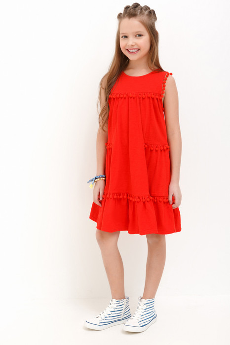 Яркое трикотажное платье без рукавов, декорированное помпонами. Свободный крой, круглый вырез горловины. Без застежки и подкладки.На ребенке представлен размер 140:- Ширина изделия по линии груди 38,5 см- Ширина по низу изделия 111 см- Длина изделия 68 смРазница между размерами составляет 1,5 см.