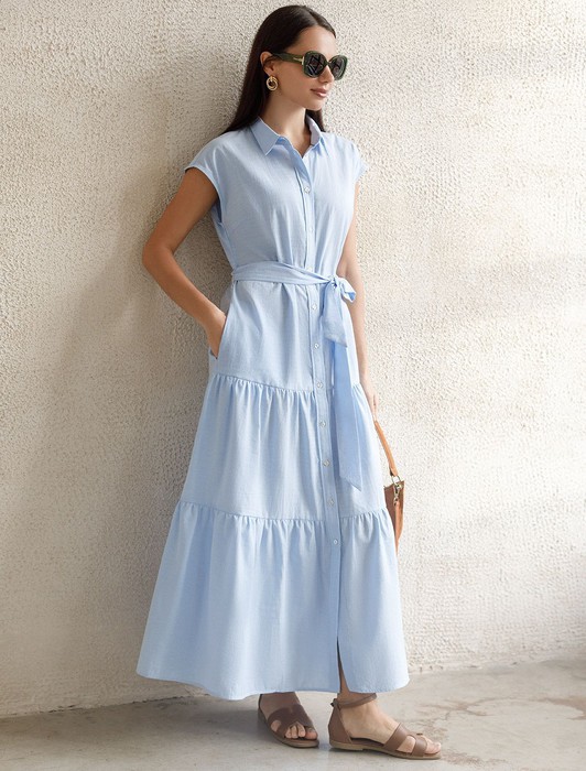 Состав: 70%Хлопок 18%ПЭ 12%Лен Плотность: 115 Г/м2Платье А-силуэта с поясом голубого цвета в тонкую белую вертикальную полоску выполнено из легкого хлопкового поплина плотностью 115 Г/м2. Воздушное платье на пуговицах по всей длине с пышной юбкой-воланами в стиле бохо отличный вариант для теплой и жаркой погоды. Модель обладает красивым ярусным кроем, который придает образу женственность и элегантность. Отложной воротничок и короткий рукав создают стильный акцент, подходящий для повседневного ношения и различных ситуаций. Талия подчеркнута поясом, который легко регулируется и подчеркивает силуэт, придавая особый шарм и аккуратность образу. Натуральный состав ткани обладает высокой воздухопроницаемостью, а также способностью поглощать и отдавать влагу. В повседневном платье будет очень комфортно, благодаря правильной регуляции температуры тела. Такая модель подходит на маленький и высокий рост, а так же на любую фигуру, позволяя подчеркнуть достоинства и скрыть возможные недостатки, так же принт в тонкую вертикальную полоску визуально стройнит и вытягивает силуэт. Это длинное платье отлично подойдет тем, кто ценит удобство и утонченность в одежде из качественной вискозы и хлопка. Красивое легкое платье прекрасно подходит для динамичного рабочего дня, городских прогулок или торжественных мероприятий, его легко адаптировать под разные ситуации и стили.