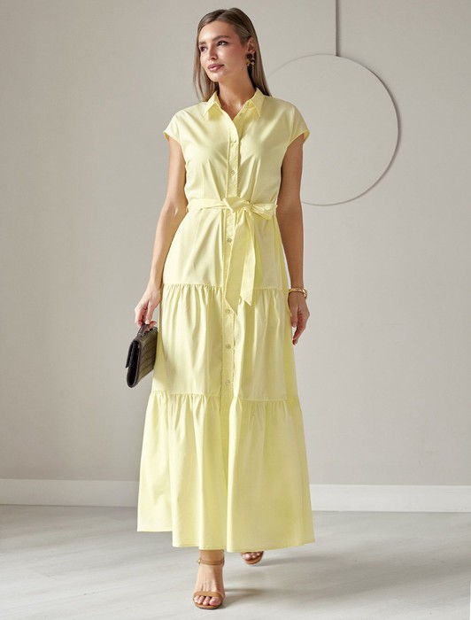 Состав: 77%Хлопок 20%ПЭ 3%ПУ Плотность: 96 Г/м2Платье А-силуэта с поясом лимонного цвета выполнено из легкого хлопкового поплина плотностью 96 Г/м2. Воздушное платье на пуговицах по всей длине с пышной юбкой-воланами в стиле бохо отличный вариант для теплой и жаркой погоды. Модель обладает красивым ярусным кроем, который придает образу женственность и элегантность. Отложной воротничок и короткий рукав создают стильный акцент, подходящий для повседневного ношения и различных ситуаций. Талия подчеркнута поясом, который легко регулируется и подчеркивает силуэт, придавая особый шарм и аккуратность образу. Натуральный состав ткани обладает высокой воздухопроницаемостью, а также способностью поглощать и отдавать влагу. В повседневном платье будет очень комфортно, благодаря правильной регуляции температуры тела. Такая модель подходит на маленький и высокий рост, а так же на любую фигуру, позволяя подчеркнуть достоинства и скрыть возможные недостатки. Это длинное платье отлично подойдет тем, кто ценит удобство и утонченность в одежде из качественной вискозы и хлопка. Красивое легкое платье прекрасно подходит для динамичного рабочего дня, городских прогулок или торжественных мероприятий, его легко адаптировать под разные ситуации и стили.