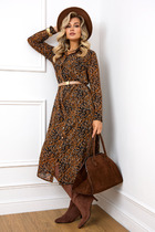 Стильный комплект, состоит из верхнего платья-рубашки и нижнего платья на бретелях. Верхнее платье прямого силуэта, с центральной застежкой по переду на петли и пуговицы, втачным воротником с отрезной стойкой, на груди с клапанами. Спинка с отрезной кокеткой, переходящей на перед. Рукав втачной, по низу с манжетой и застежкой на пуговицы. Нижнее платье-комбинация на бретелях, с нагрудными вытачками по переду. В комплекте идет съемный кожаный пояс, с металлической пряжкой.