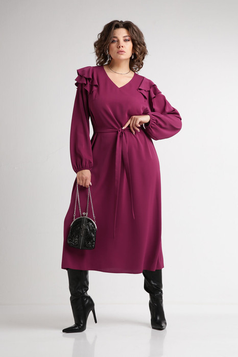 Нарядное платье с V-образным вырезом горловины из струящейся приятной на ощупь ткани.  Данное платье отличный вариант как для торжественных мероприятий, так и для деловых офисных луков, оно прекрасно впишется как в праздничный, так и в повседневный гардероб женщины. Важной изюминкой платья являются воланы - крылышки. Платье имеет свободный крой, что добавляет удобство в движении.Рукав втачной, длинный расширеный к низу со сборкой на эластичную ленку по низу. В комплект входит пояс подчеркивающий талию.  Длина платья  121см, длина рукава 62 см.