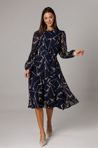 Женственное платье приталенного силуэта из легкой ткани "Ниагара". Округлая горловина на внутренней обтачке. Втачной рукав длинной 3/4 присборен на манжету. Модель отрезная по линии талии, присборена на эластичную резинку. Низ ровный, без разрезов. Линию талии подчеркнет пояс - "кушак".