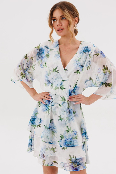 Платье свободного силуэта, отрезное по линии талии с цельнокроенным рукавом "летучая мышь". Лиф переда на запах. Юбка двойной колокол. По талии резинка. Платье на подкладке.