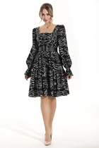 Платье женское приталенного силуэта, выполнено из костюмной ткани. По переду имитация застежки на петли-пуговицы, воротник стойка, на рукавах шлицы, по спинке застежка на молнию. Изделие на подкладке.