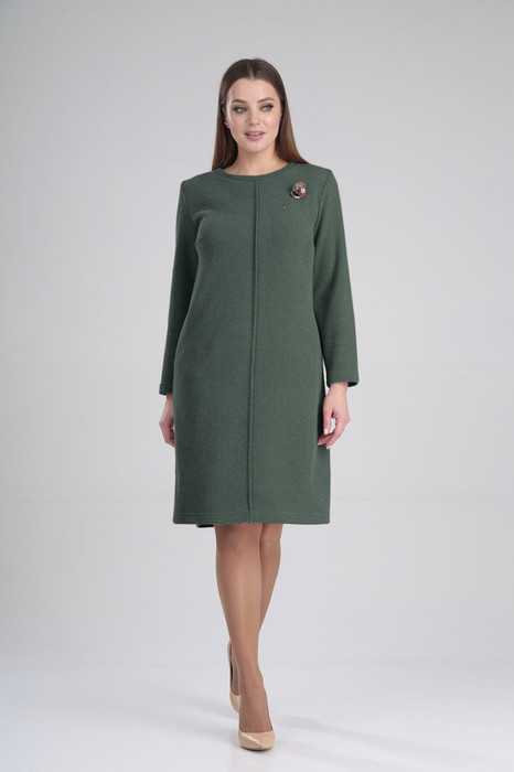 Тёплое женское  платье свободного покроя  может украсить гардероб  многих женщин. Круглый вырез горловины, обработанной бейкой, по центру переда защип на 0,5см и прорезные карманы с листочкой. Спинка платья со средним швом. Декоративное украшение прилагается.