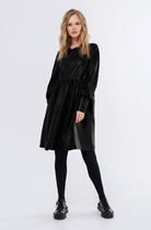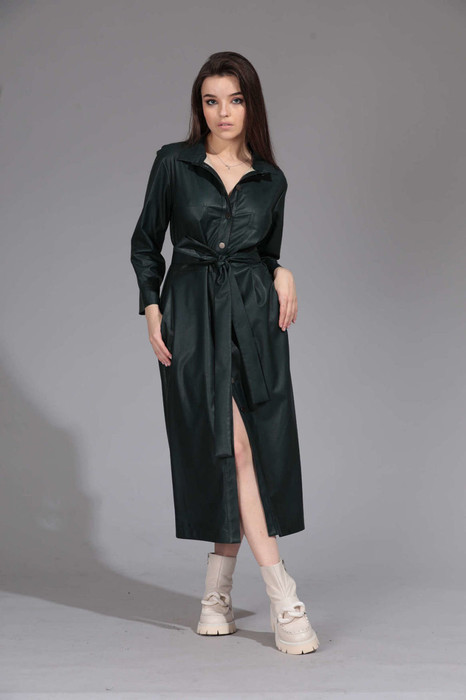 Трендовое платье на расстежку, из очень приятной эко-кожи на хлопковой основе. Карманы на груди и в боковых швах. Пояс сьемный.