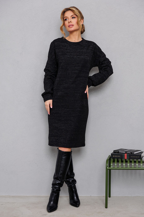 Платье из очень эффектного трикотажа с лёгким блеском. Впечатляют красотой объёмные рукава на манжете. Изделие без подкладки и без застёжки.