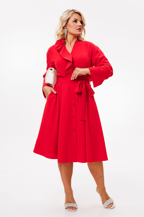 Элегантное женское палтье необычного кроя станет изюминкой вашего гардероба. Платье прилегающего силуэта, отрезное по линии талии, по передеу застежка на петли и пуговицы, в верхней части платья по полочке прилегание создается за счет талиевых выточек, по спинке - за счет резинки по линии талии. Юбка-полусолнце с односторонними складками, по бокам карманы. Плечо спущенное, рукав укороченный, на высокой манжете на одну пуговицу. Горловина по полочке выполненна в виде цельнокроеной стойки, переходящей в отрезную по спинке. В качестве декора по краю борта идет жабо, переходящее в цветок. . В комплекте съемный пояс в тон платья. Длина по спинке:-111см. Длина рукава с манжето -51см.