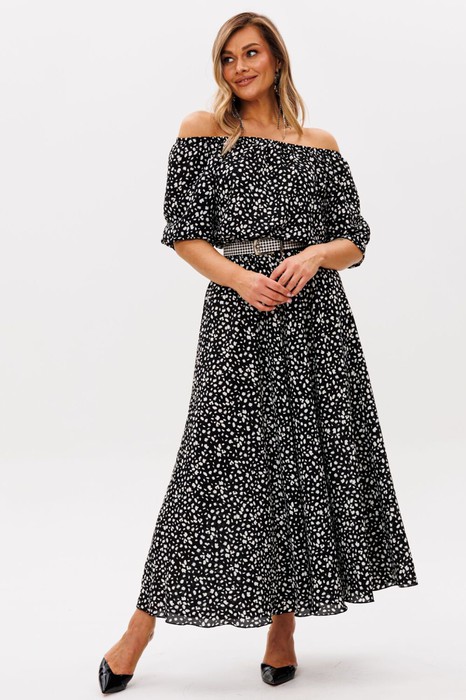Платье макси свободного силуэта - лучший выбор на лета. Рукав реглан 3/4 длины, низ на резинке. Горловина собрана на резинку. Платье отрезное по линии талии, на резинке. Юбка полусолнце. В комплект входит съемный пояс. Длина юбки: 93см . Длина рукава: 43см. Длина спинки: 42см.