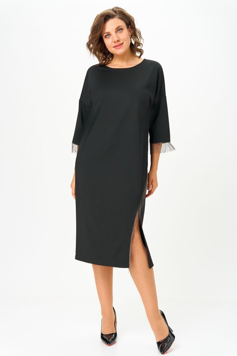 Черное платье миди — не просто одежда, это заявление о вашем стиле и вкусе. Элегантное праздничное платье прямного силуэта из трикотажного полотна. Ткань не мнется. Благодаря своему крою подойдёт для разных типов фигуры. Оно подчеркнёт вашу индивидуальность и станет отличным дополнением к вашему гардеробу. В нём вы будете чувствовать себя уверенно и комфортно, зная, что выглядите на все сто. Выбирая его, вы выбираете качество, комфорт и стиль. Классическое черное платье прямого силуэта, со спущенным плечом. По переду идет подрез с разрезом. В качестве декора по подрезу и низу рукава- металлизированная бахрома. По спинке идет средний шов. Такое платье незаменимая вещь в любом гардеробе. Рекомендуется носить на черное белье. Длина платья по спинке (48-52) - 108см, (54-58) - 112 см. Длина рукава: (48-58) - 24 см.