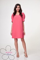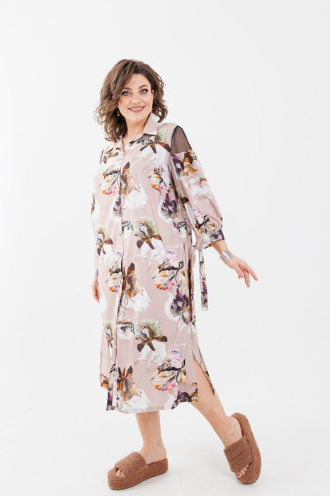 Платье с кружевными вставками по рукаву. Выполнено из оригинального принтованного полотна. Прямой силуэт, втачной рукав, рубашечный воротник на стойке, функциональная застёжка на пуговицы по всей длине. Особенностью и украшением платья являются рукава, в верхней части которых вставлена сетка.