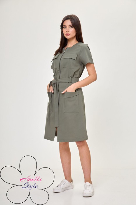 Платье прямого силуэта, чуть расширенное к низу, длина до колен, по переду на молнии. Притачной пояс на резинке по спинке, для лучшего прилегания.  Функциональные нагрудные и набедренные карманы по переду. Втачной короткий рукав. Подчеркнуть талию можно при помощи съемного пояса. Платье идеальный вариант для сезона весна-лето, в нем вы будете чувствовать себя комфортно и стильно. С уверенностью можно сказать, что эта модель будет актуальна не один сезон.