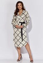 Платье женское, прямого силуэта, чуть расширенное к низу, длина за колено. Рукав втачной, длина 3/4, низ на резинке. По переду нагрудные вытачки и застежка на петли пуговицы до талии. Горловина обработана отложным воротником с рюшей. Дополнительно талию можно подчеркнуть при помощи съемного пояса. Стильное, женственное и многофункциональное платье станет отличным дополнением вашего образа.
