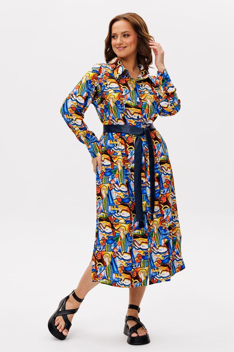 Особый шарм платью придаёт съёмный пояс с кисточками, подчёркивающий талию и добавляющий нотку игривости. А принт «Пикассо» оживляет образ, наполняя его художественной теплотой и романтикой.