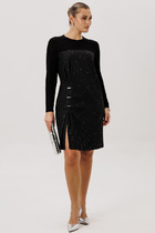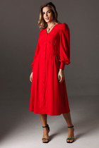 Элегантный V-образный вырез горловины подчеркивает линию шеи, добавляя образу женственности и утонченности. Удобная планка с застежкой на петли и пуговицы придает платью стильный акцент и позволяет легко регулировать посадку.