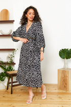 Погрузитесь в мир элегантности и утонченности с этим потрясающим платьем А-силуэта. Его изысканный V-образный вырез нежно обрамляет шею, придавая образу особую грацию и шарм. Рукава длиной 3/4, выполненные с легким расширением к низу, добавляют воздушности и романтики, а резинка на рукавах обеспечивает комфорт и свободу движений.