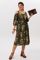 Средней длины прямой силуэт мягко скользит вдоль фигуры, сохраняя баланс между свободным объемом и женственными линиями. Натуральная льняная ткань с ее благородной текстурой и теплым оттенком придает образу особую глубину и естественное изящество.