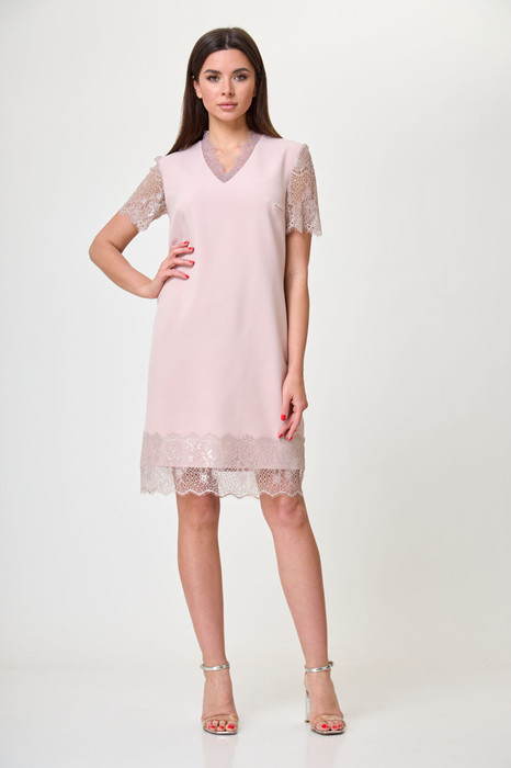 Короткое платье с гипюром  - это стильное платье, которое выполнено из качественного текстиля и украшено французским кружевом (дополняет жакет, модель 655). V-образный вырез горловины, горловина, рукава и низ платья декорированы кружевом. Застежка молния в среднем шве по спинке платья. Выполнено на подкладке.