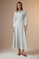 Полуприлегающий силуэт, вертикальные рельефы от проймы по переду и спинке платья, двубортное с отложными лацканами и воротником, ассиметричная застёжка на молнии, втачные рукава 3/4 длины со складкой по низу.