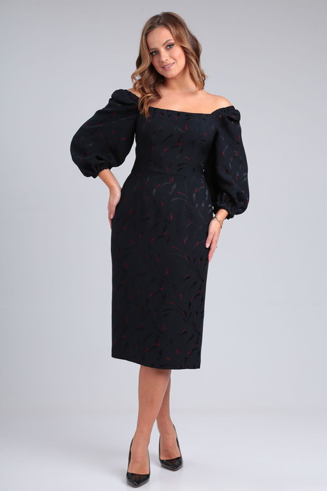 Платье из костюмно-плательной ткани приталенного силуэта длиной чуть ниже колена. Вырез горловины квадратной формы. Отрезное по линии талии. Перед и спинка с рельефами. По спинке средний шов, в котором вставлена потайная молния, внизу разрез. Рукав втачной длиной 3/4, по окату собран на резинку, в нижней части рукава сборка на резинку.