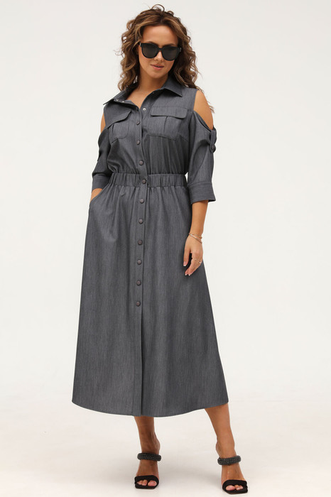Платье полуприлегающего силуэта, расклешенное книзу. Воротник отложной, на притачной стойке. Платье отрезное по линии талии, на широкой резинке. Платье с центральной застежкой на кнопки на притачных планках. Полочка с нагрудными вытачками и накладными карманами со складкой и клапаном. В боковых швах юбки функциональные карманы. Рукав втачной длинной 3/4, с открытым плечом и декоративной патой на кнопке, понизу - широкая притачная манжета с застежкой на кнопки.