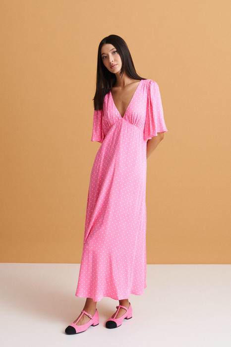 Платье полуприлегающего силуэта с фигурным отрезом выполнено из нежно-розового полотна с принтом белый горох. Характеристики: отрезное, отрез фигурный, горловина V образный вырез, рукав втачной струящийся, низ свободного кроя на подкладке, в боковом шве - потайная молния. Длина платья 127 см, длина 34.