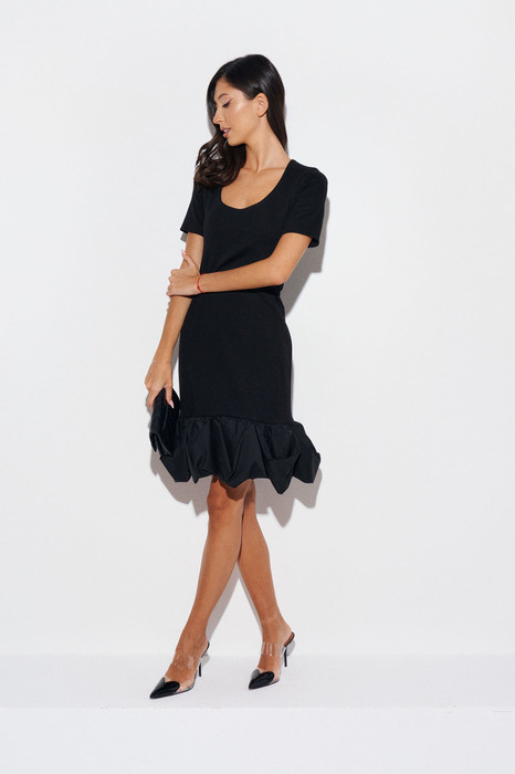 Платье прямого кроя выполнено из комбинированных тканей черного цвета. Характеристики: прямой крой, овальная горловина, рукав короткий втачной, основное полотно изделия - трикотаж, низ выполнен декоративной сборкой с подгибом из хлопкового полотна. Длина по спинке 92 см, длина рукава 24 см.
