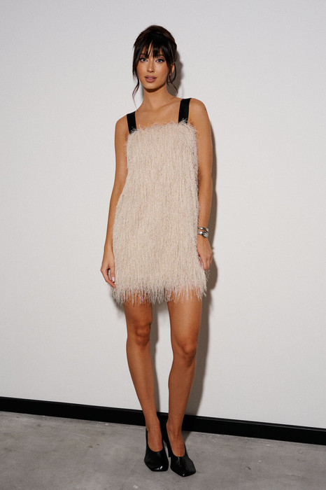 Платье-мини, крямого кроя. Выполнено из полотна с длинным ворсом, кремового цвета с мелкими блестками. Широкие бретели, есть подкладка. Длина спинки 57 см.