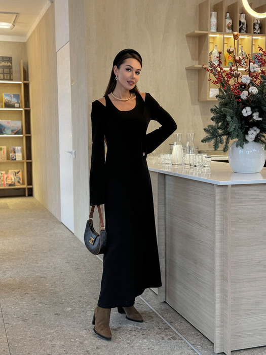 Платье в длине макси выполнено из трикотажа среднеей плотности. Верх платья обработан глубоким вырезом-лодочка и бретелями, имитирующими майку